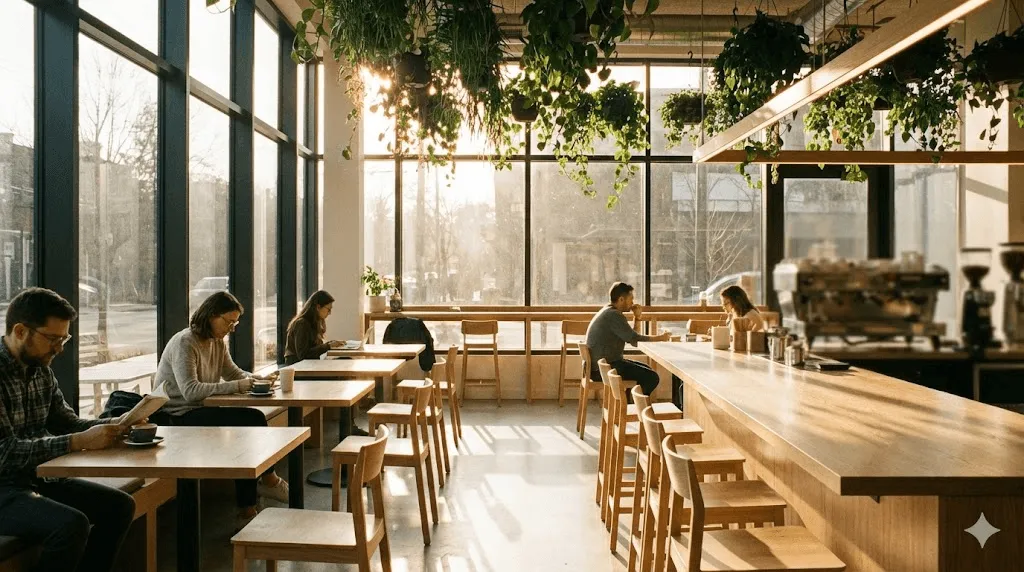 Attempt 3: "Modern coffee shop interior with large windows, natural light, plants hanging from ceiling, warm wood tones" Result: Now we're talking. This had character.