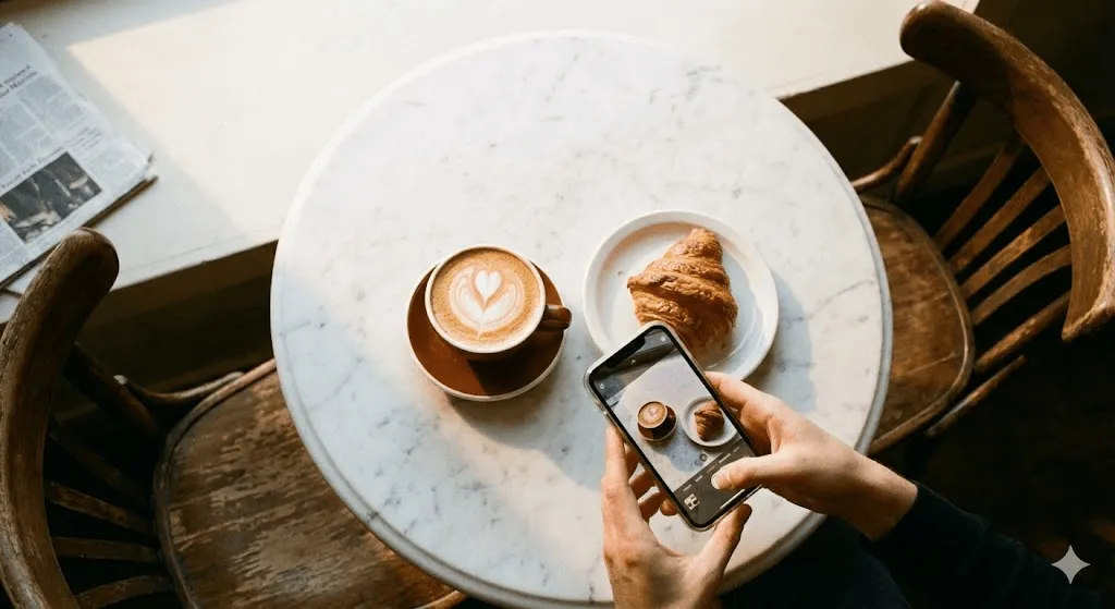 Final attempt: "Cozy modern coffee shop interior, wide angle view, morning sunlight streaming through floor to ceiling windows, hanging plants, light wood furniture, warm and inviting atmosphere" Result: Exactly what I needed. Took it, dropped it into the design, shipped it.