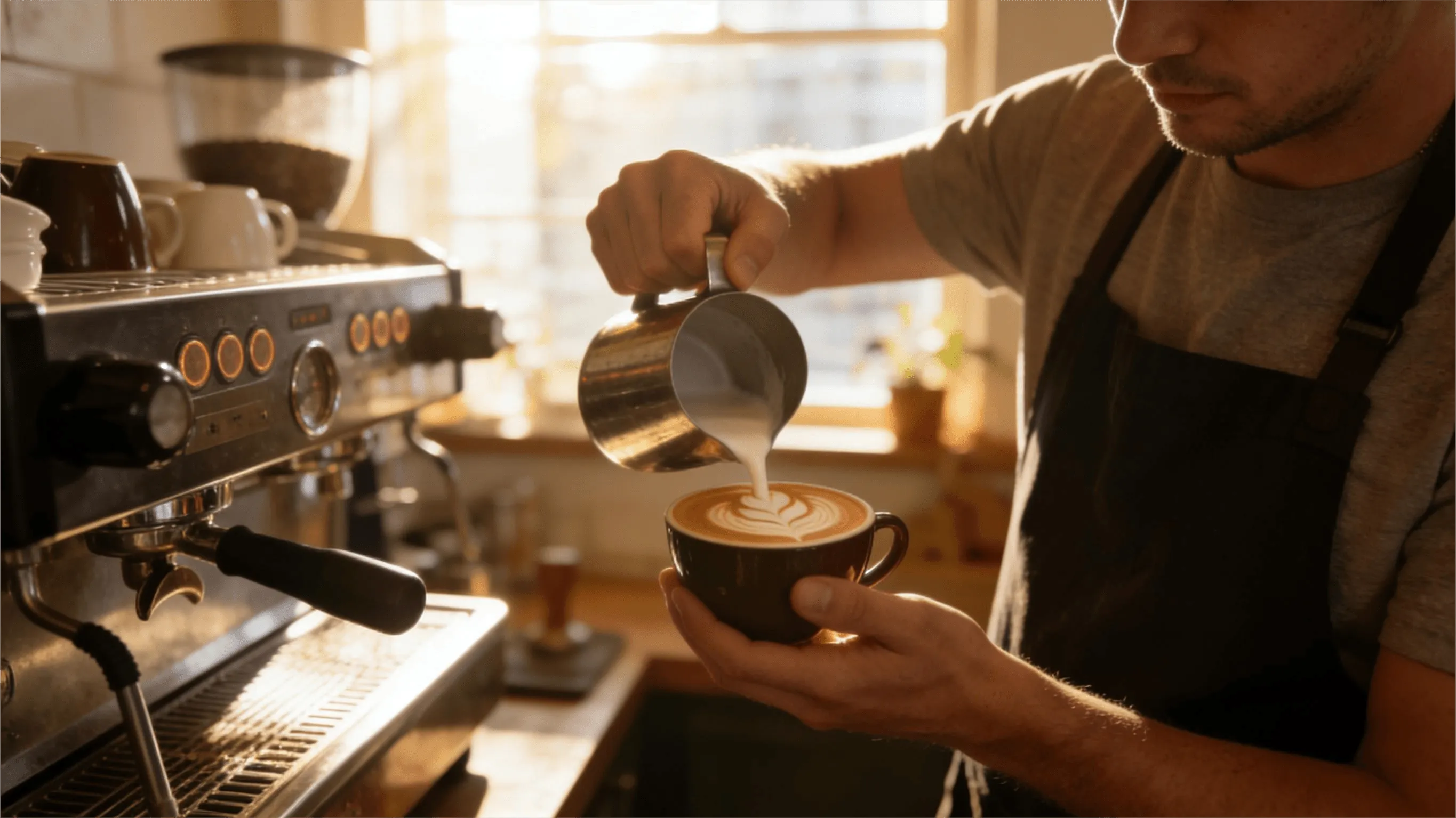 "A barista in a cozy coffee shop pours steamed milk into a latte, creating latte art. Morning sunlight streams through the window. Cinematic, shallow depth of field."