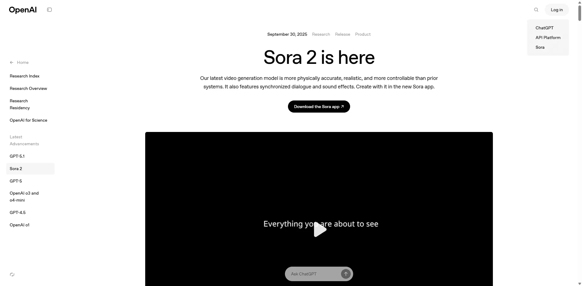 Sora 2 is more physically accurate, realistic, and controllable than prior systems, featuring synchronized dialogue and sound effects.